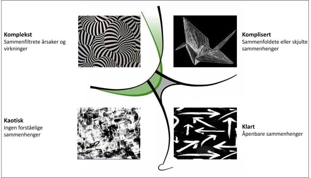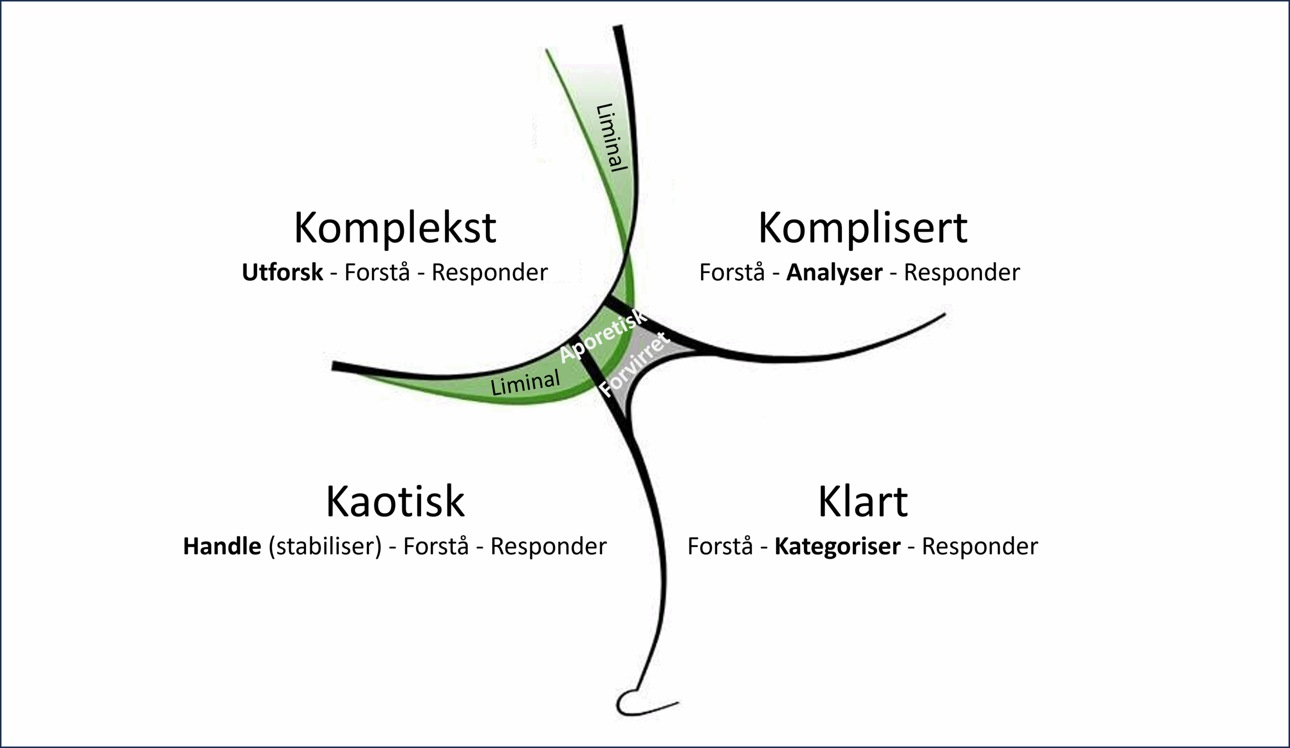 Cynefin er delt inn i problemdimensjonene Klart, Komplisert, Komplekst, Kaotisk og Forvirret/Aporetisk. I tillegg har vi de liminale områdene markert med grønt i figuren: