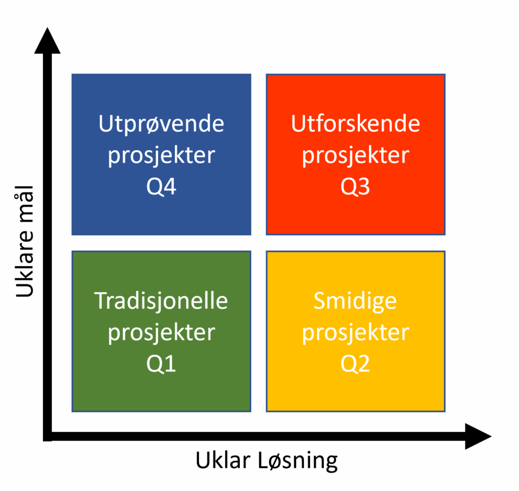 Hvis målene og løsningen er klare, er prosjektet «tradisjonelt». Hvis målene er klare mens løsningen er uklar, er prosjektet «smidig». Hvis både målene og løsningen er uklar, er prosjektet «utforskende». Hvis løsningen er klar, men man må finne ut hvordan den bør brukes, er prosjektet «utprøvende».