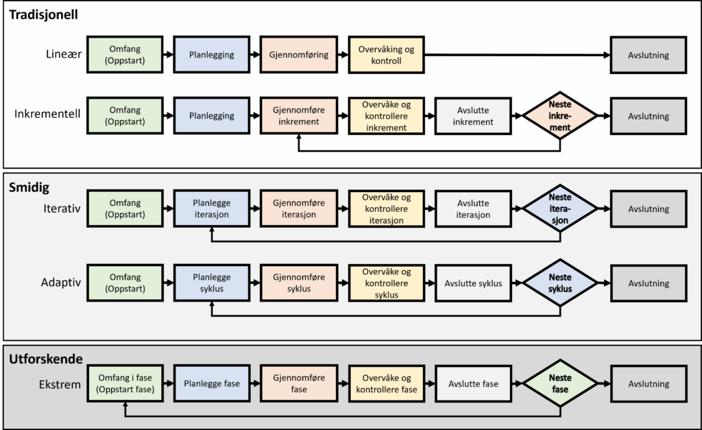 Den lineære og den inkrementelle modellen egner seg for styring og kontroll av fossefallsprosjekter. Den iterative og den adaptive egner seg for smidige prosjekter, der sistnevnte håndterer størst usikkerhet i mål og løsning. Den ekstreme egner seg for R&D.