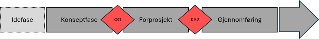 Etter investeringsbeslutning i Stortinget kommer så Gjennomføringen, der tiltaket iverksettes.